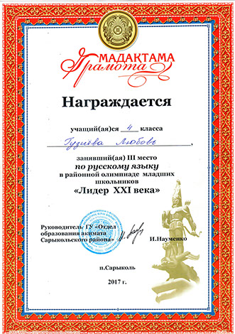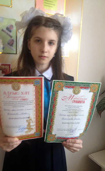 Колесникова Алина победитель в районном конкурсе Тіл шамшырақтары 2015г., 2016г.