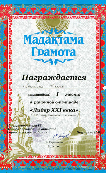 Лысенко Алёна, ученица 4 класса, 1 место в районной олимпиаде по познанию мира ЛИДЕР 21 века, 2014