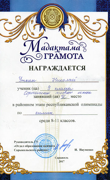 Уткин Николай, ученик 9 класса, 3 место в районном этапе республиканской олимпиады, 2017г.