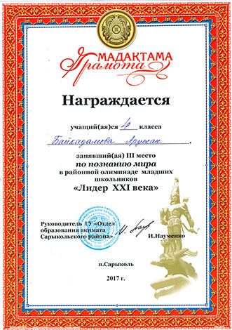 Байкадалиева Аружан 3 место в районном конкурсе "Лидер 21 века"